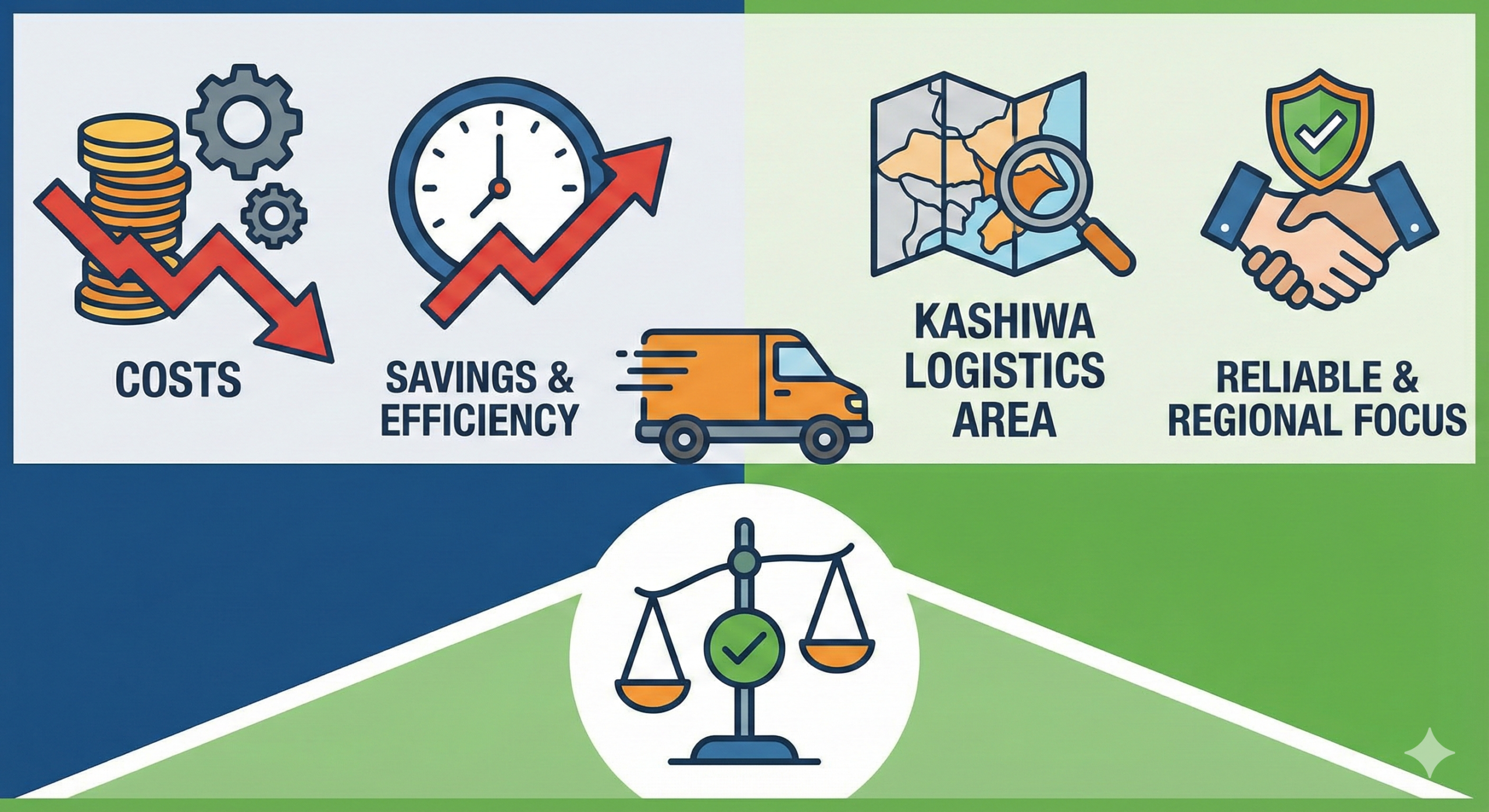 - 柏ロジ圏に特化することで移動距離を平均30%短縮し、地域密着による品質安定とドライバー固定の安心感が適正価格を実現している